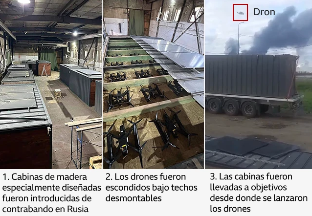 El ataque involucró 117 drones FPV, de relativamente bajo costo (aunque no tan bajo como otros medios resaltan), lanzados desde camiones estacionados cerca de las bases. Los drones fueron transportados clandestinamente a Rusia, ocultos en contenedores de madera con techos removibles activados remotamente. Este método permitió que los drones, se desplegaran directamente en las inmediaciones de los objetivos, burlando las defensas aéreas rusas diseñadas para contrarrestar misiles o drones de mayor alcance. Videos difundidos por el SBU muestran drones impactando aviones, incluyendo modelos Tu-95 en Belaya y Olenya, y al menos dos A-50 en Ivanovo.